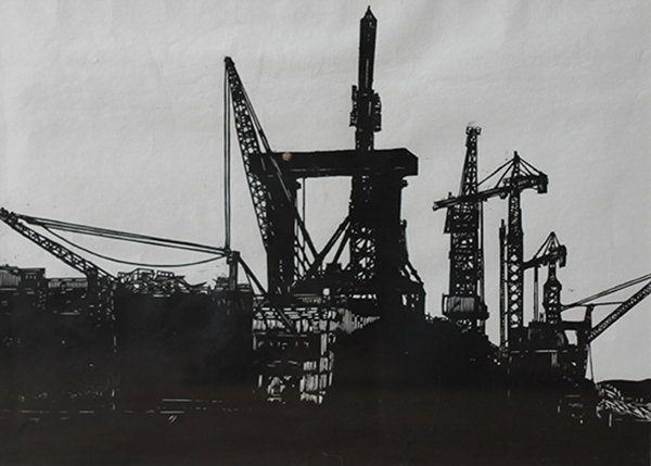 版画《繁忙的大坝工地》 陈璇(美教2007级)